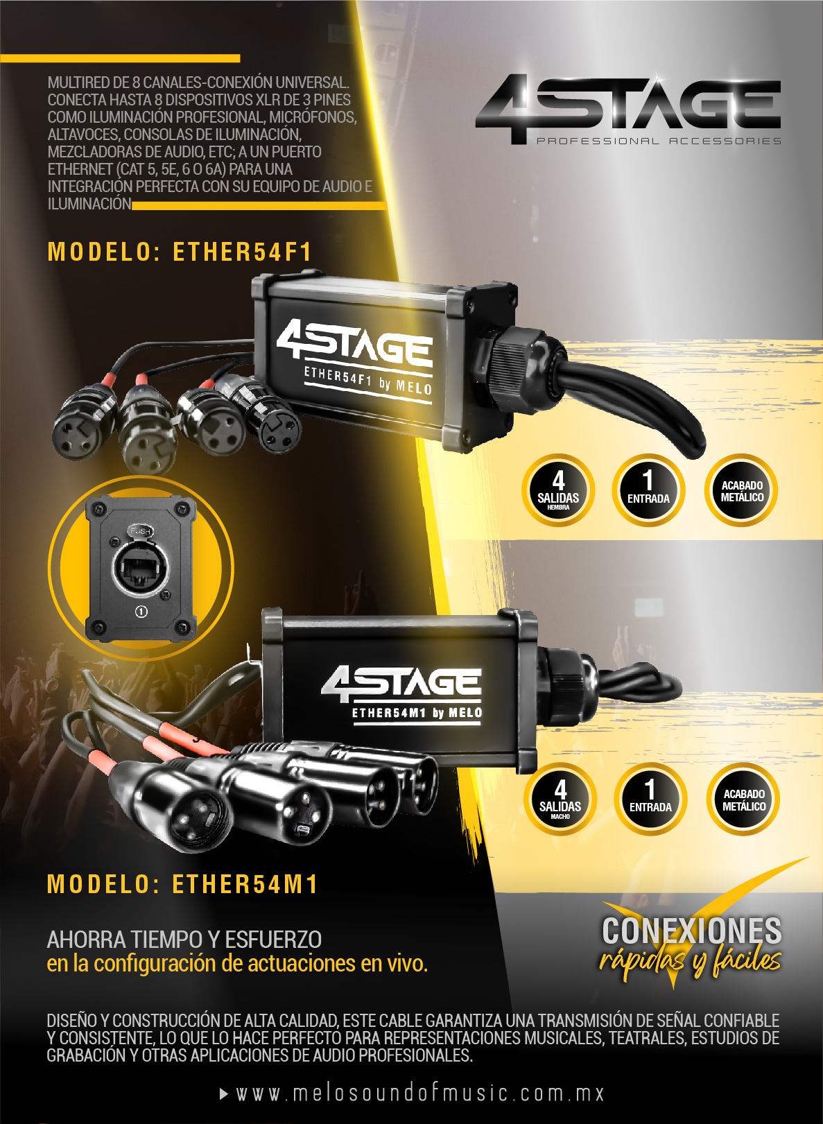 Multired de 4 canales-conexión universal. Conecta hasta 4 dispositivos XLR de 3 PINES como iluminación profesional, micrófonos, altavoces, consolas de iluminación, mezcladoras de audio, etc. a un puerto ethernet (CAT 5, 5E, 6 O 6A) para una integración perfecta con su equipo de audio e iluminación.